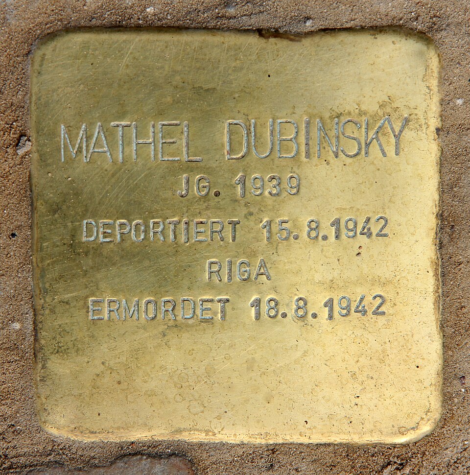 [4] Elfriede (née Lewinsohn) Dubinsky was born on November 28, 1923, in Nauen. She was deported with her daughter and husband from Berlin to Riga on August 15, 1942, on Transport 18, Train Da 401.